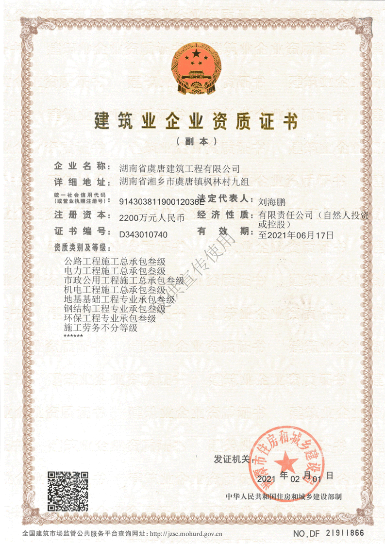 鋼結(jié)構(gòu)專業(yè)承包叁級、環(huán)保工程專業(yè)工程承包叁級、承裝(修、試)電力設(shè)施四級、路面養(yǎng)護乙級資質(zhì)、橋梁養(yǎng)護乙級資質(zhì)、隧道養(yǎng)護乙級資質(zhì)、交通安全設(shè)施養(yǎng)護乙級資質(zhì)、施工勞務不分等級等多項施工資質(zhì)。